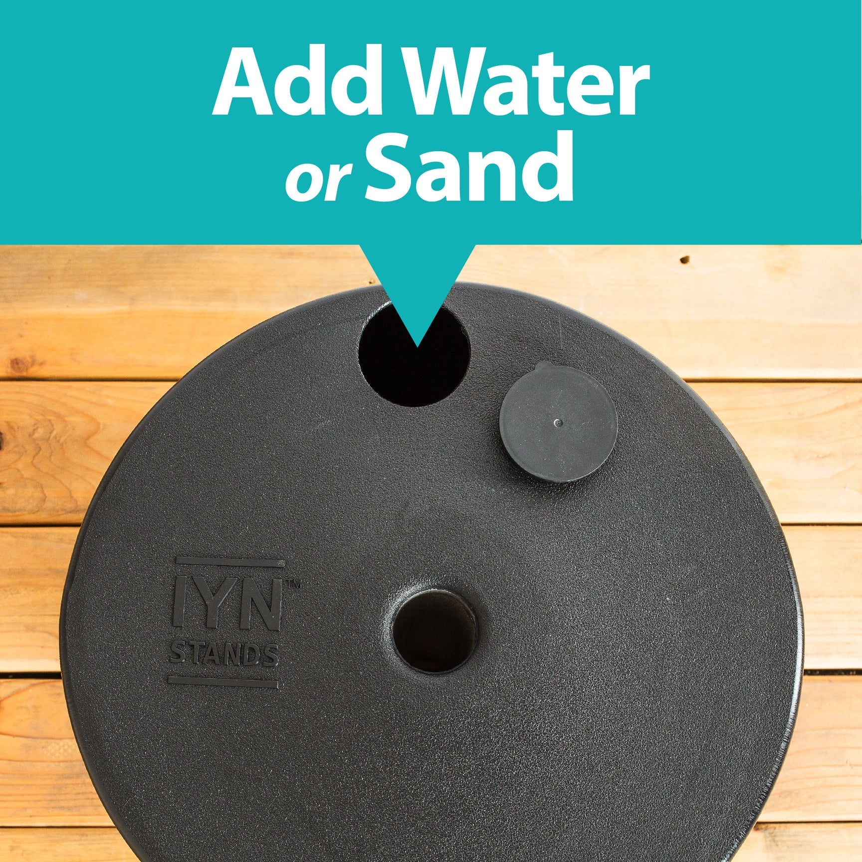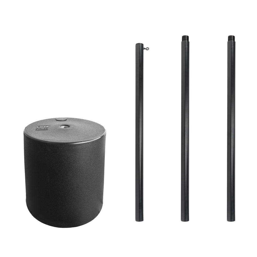 Our 9'6" powder-coated steel pole assembles in three pieces and includes an eye bolt and carabiner for secure light attachment. The polypropylene tank base can be filled with water (123 lbs) or sand (186 lbs), making it stable on grass, concrete, decks, or indoor floors—no tools or permanent hardware required.